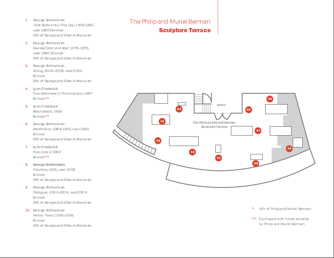 Since the Berman’s first gift of outdoor sculpture in 1980, other generous benefactors have included George and Ellen Anthonisen, Joe Mooney, the Philip and Muriel Berman Foundation, the family of G. Noble Wagner, and others.